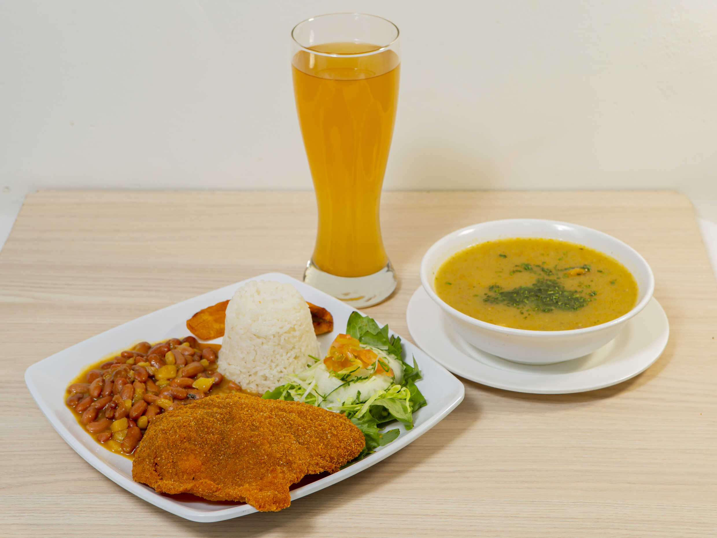 Proteina a elección acompañada de: Sancocho, Frijoles, arroz, ensalada, maduro y jugo del día