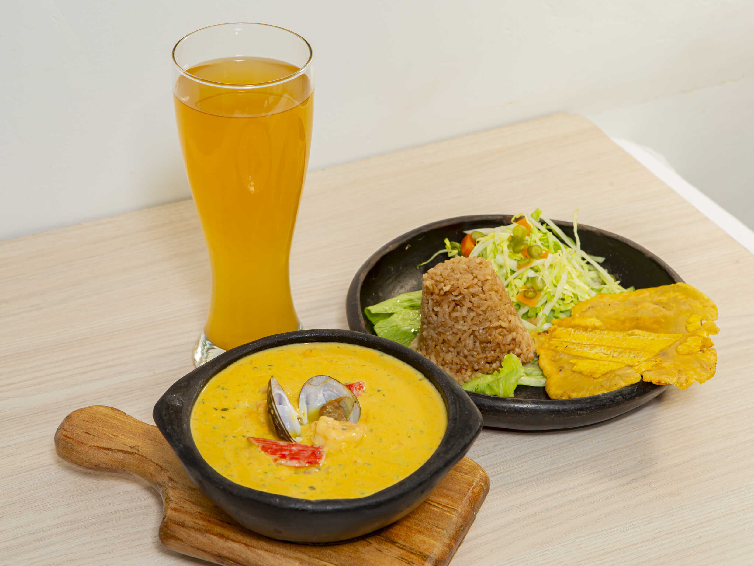 Exquisita mezcla de mariscos del pacifico (camarón, calamar pulpo, caracol, mejillón) en crema de leche de coco, acompañado de arroz, ensalada y patacón.