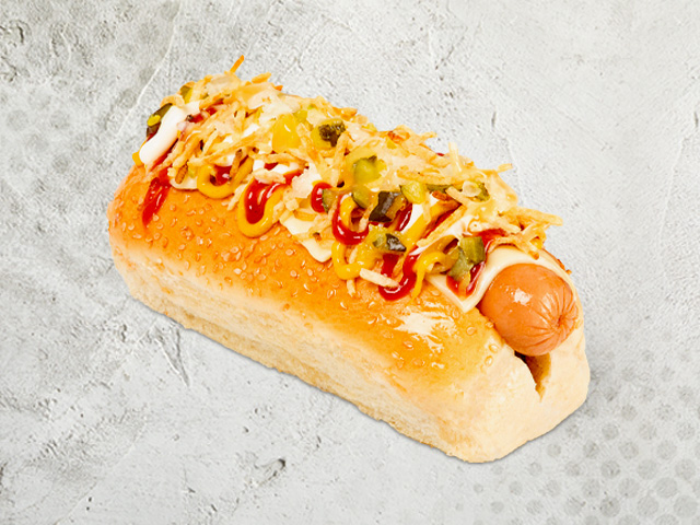 Perro caliente con salchicha americana, papas cabello de ángel, queso costeño, pepinillos y salsas.