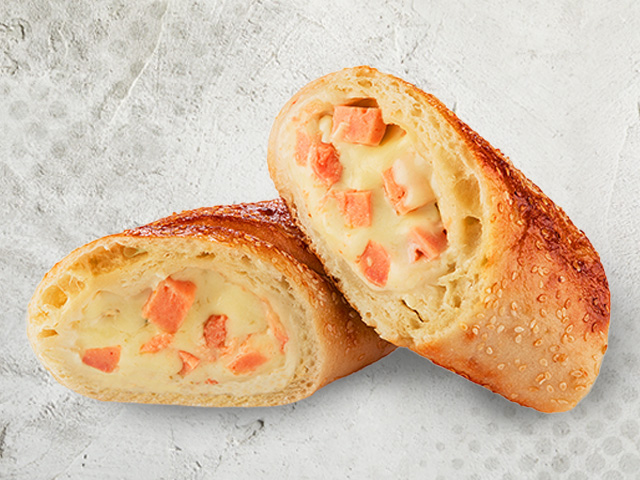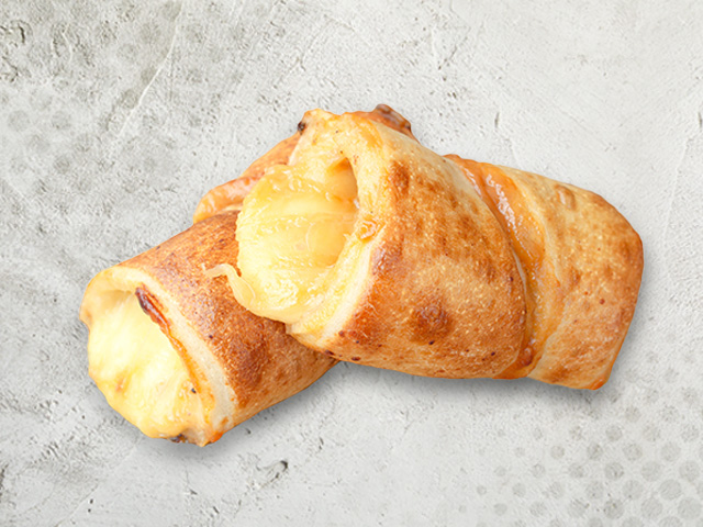Rollo de masa de pizza, relleno de queso mozzarella recién rallado, queso parmesano y jamón, porción personal.