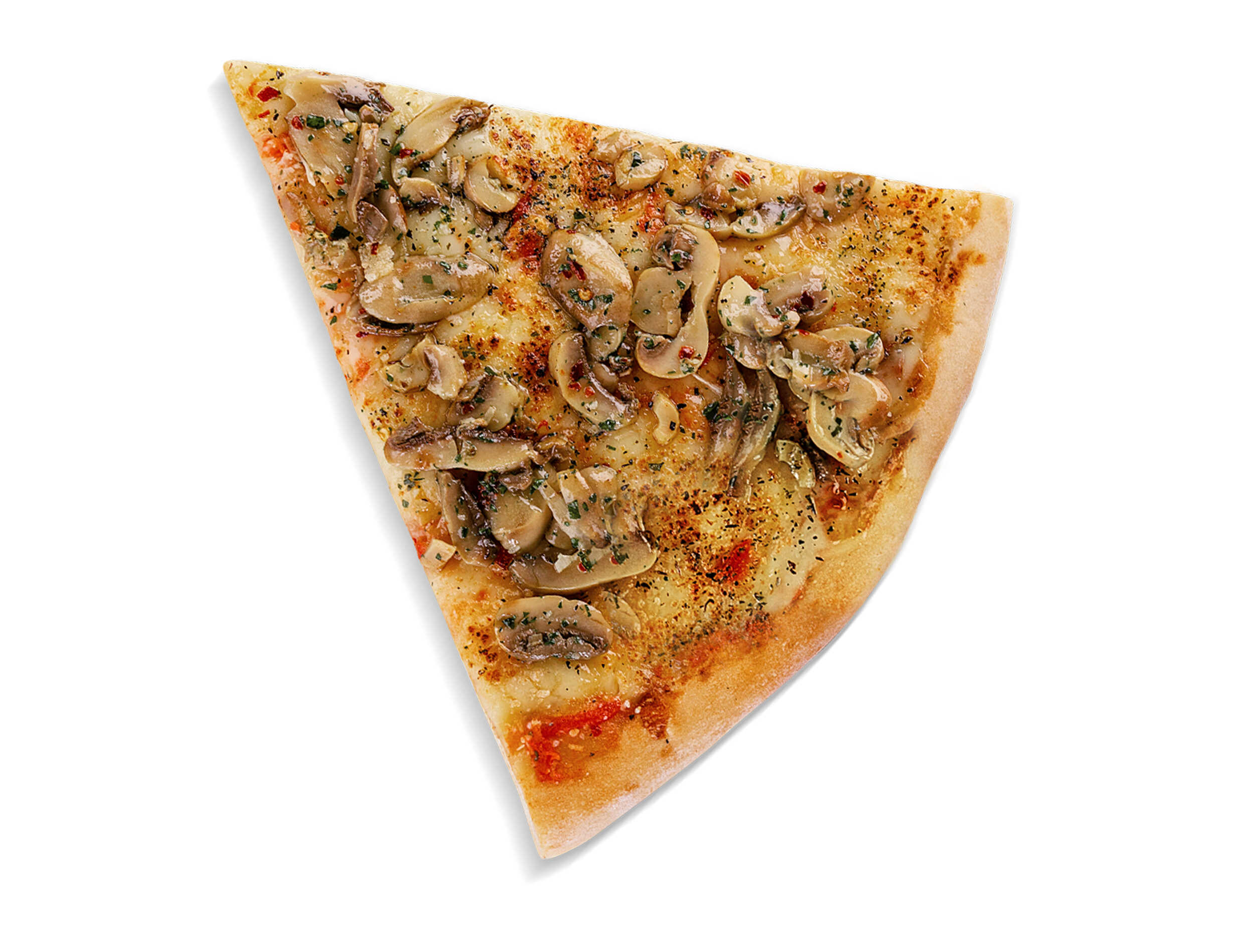 Porción de pizza con masa fresca preparada a mano, salsa de tomate estilo san marzano, queso mozzarella, queso parmesano y champiñones, porción personal.