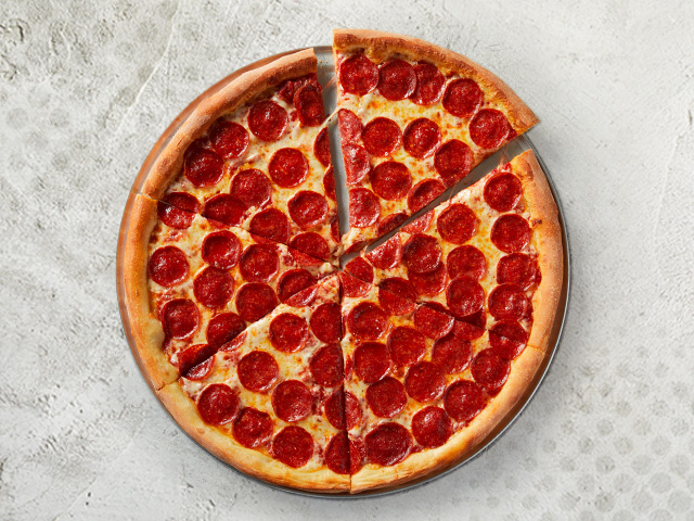 Pizza con salsa de tomate estilo san Marzano, queso mozzarella, queso parmesano y pepperoni, elige tu tamaño.