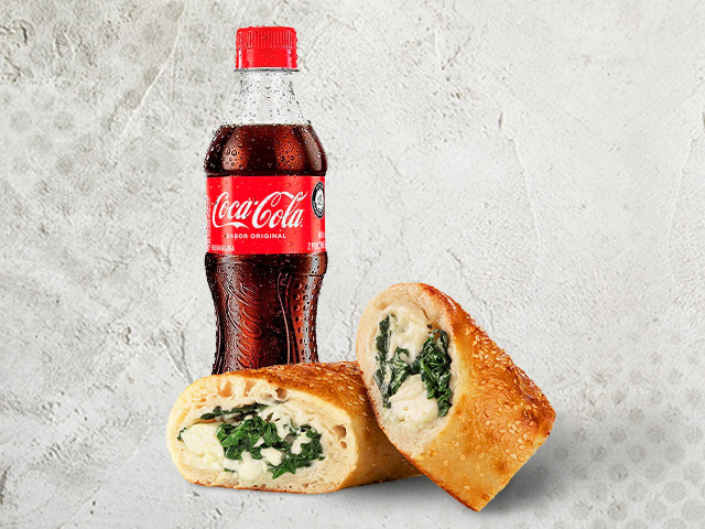 Rollo de masa de pizza, con sabor a elegir, relleno de queso mozzarella y queso parmesano, Coca-Cola original.