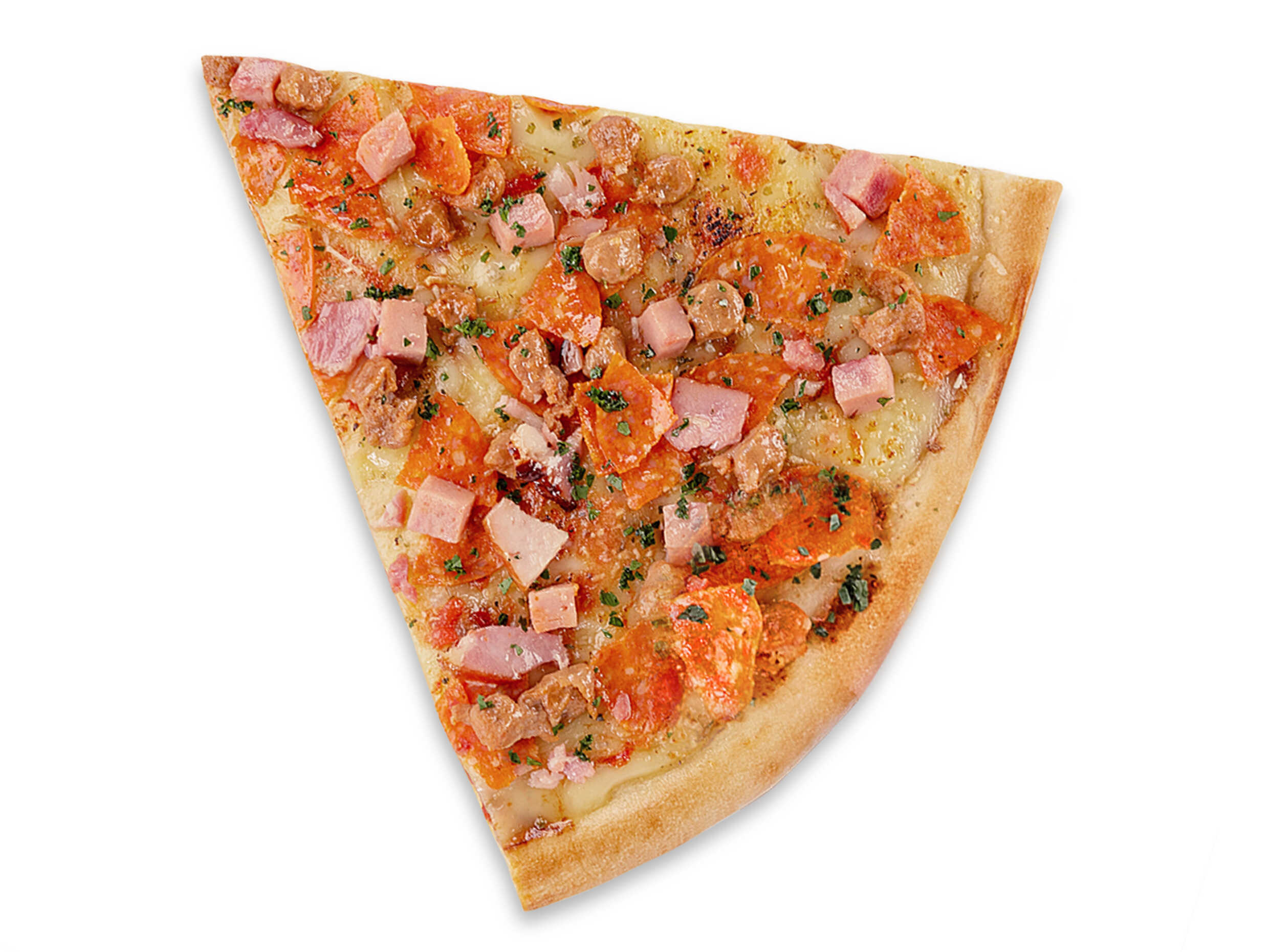 Porción de pizza con masa fresca preparada a mano, con salsa al estilo san manzano, queso mozzarella de leche entera, pepperoni, salchicha italiana, jamón y tocineta.