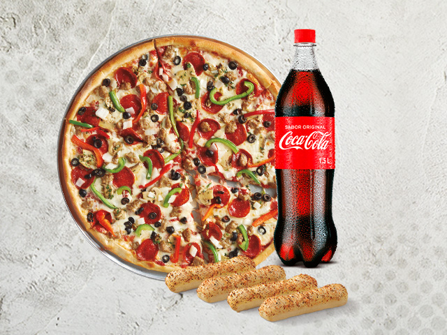 1 Pizza M de 12 pulgadas en combo con 4 Breadsticks y una Coca-Cola de 1.5 Lt