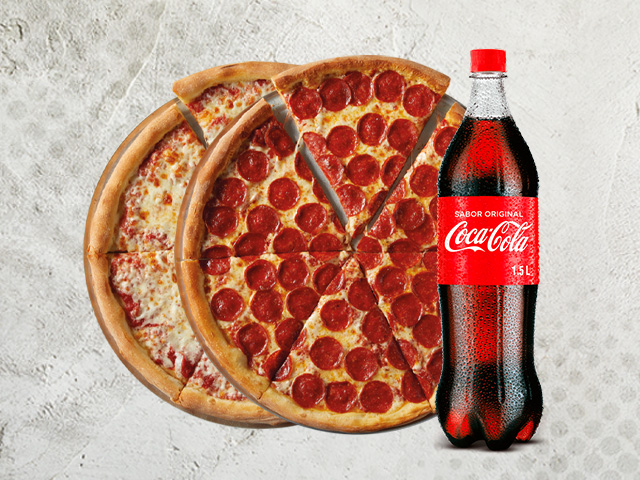 2 Pizzas medianas sencillas sabor a elegir más Coca Cola Original 1.5 lts.