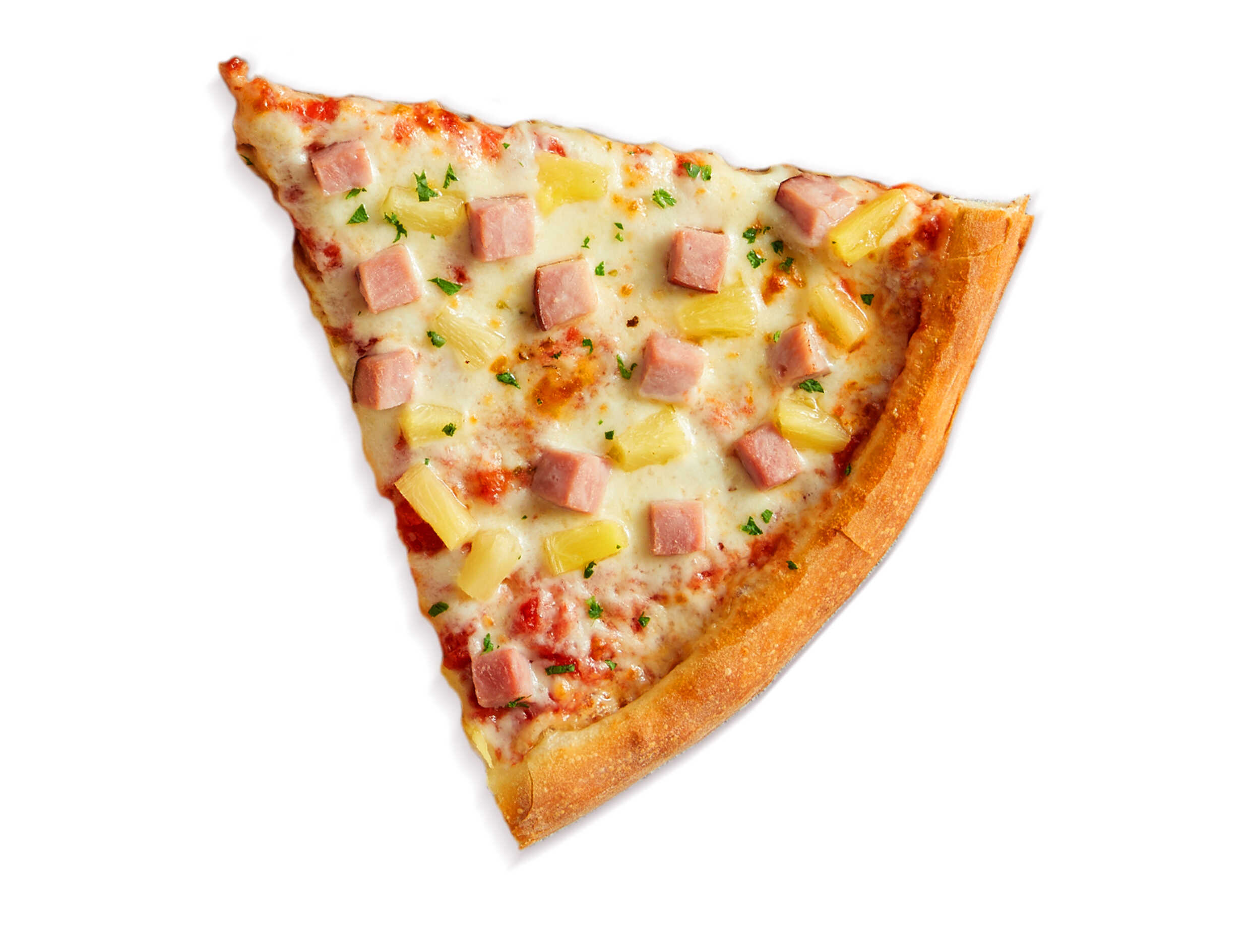 Porción de pizza con masa fresca preparada a mano, salsa de tomate estilo san marzano, queso mozzarella, queso parmesano, jamón y piña, porción personal.
