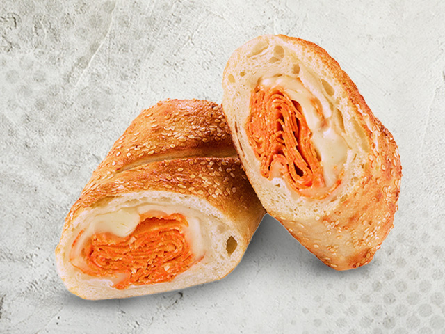 Rollo de masa de pizza relleno de queso mozzarella rallado, queso parmesano y pepperoni, porción personal.