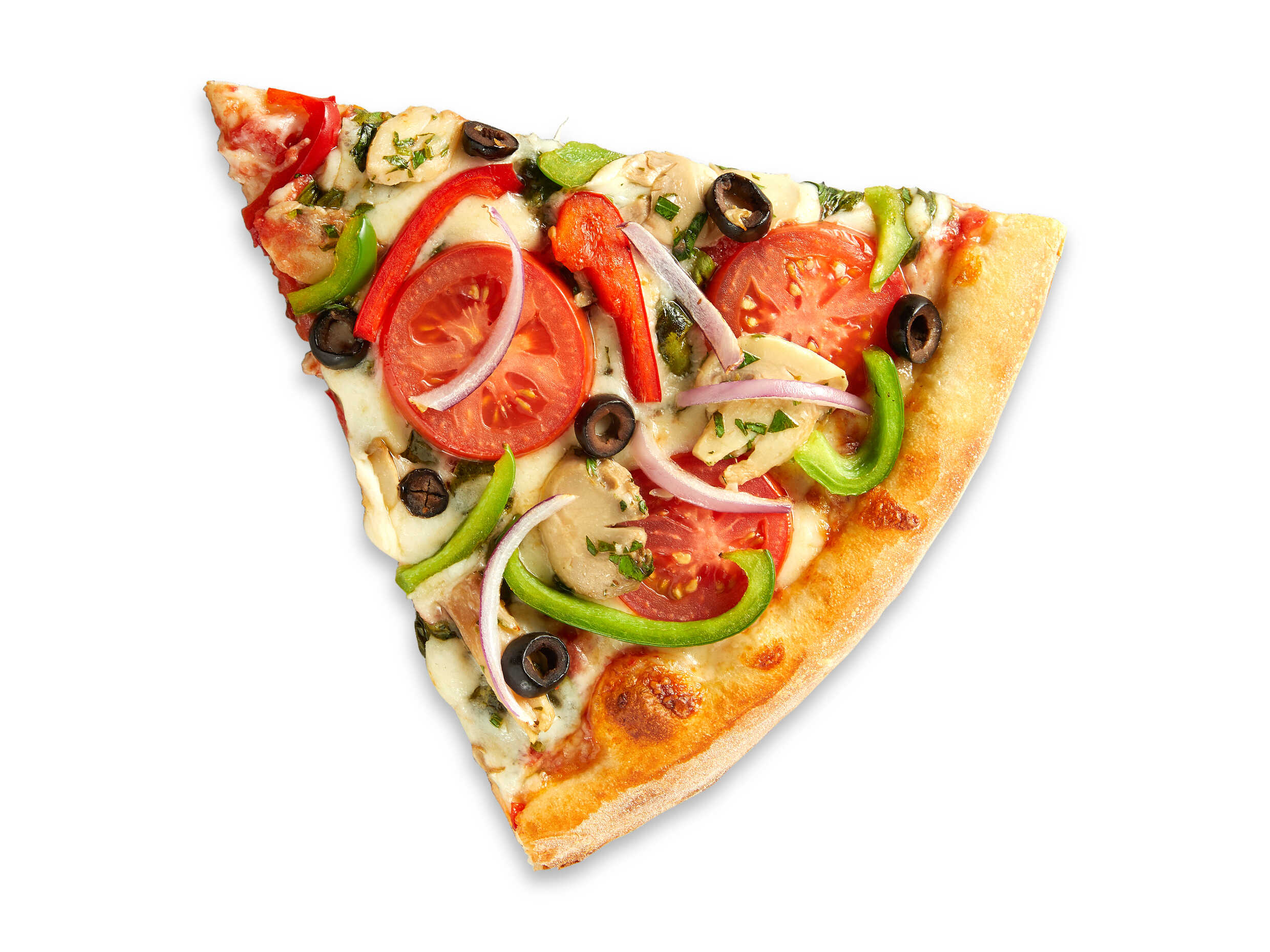 Porción de pizza de masa fresca hecha a mano, salsa al estilo san marzano, queso parmesano, pepperoni, salchicha italiana, champiñones, pimentones, aceitunas.
