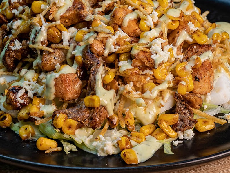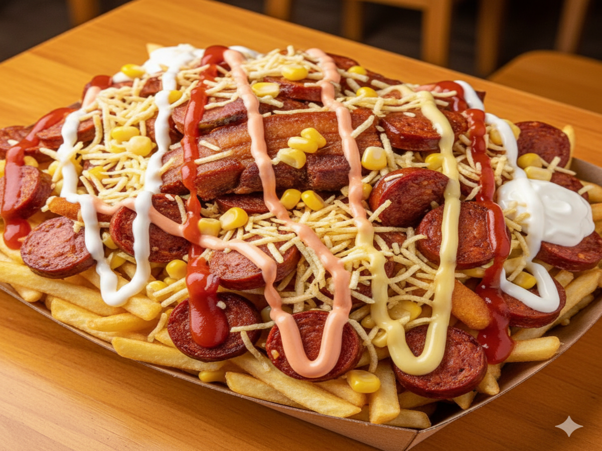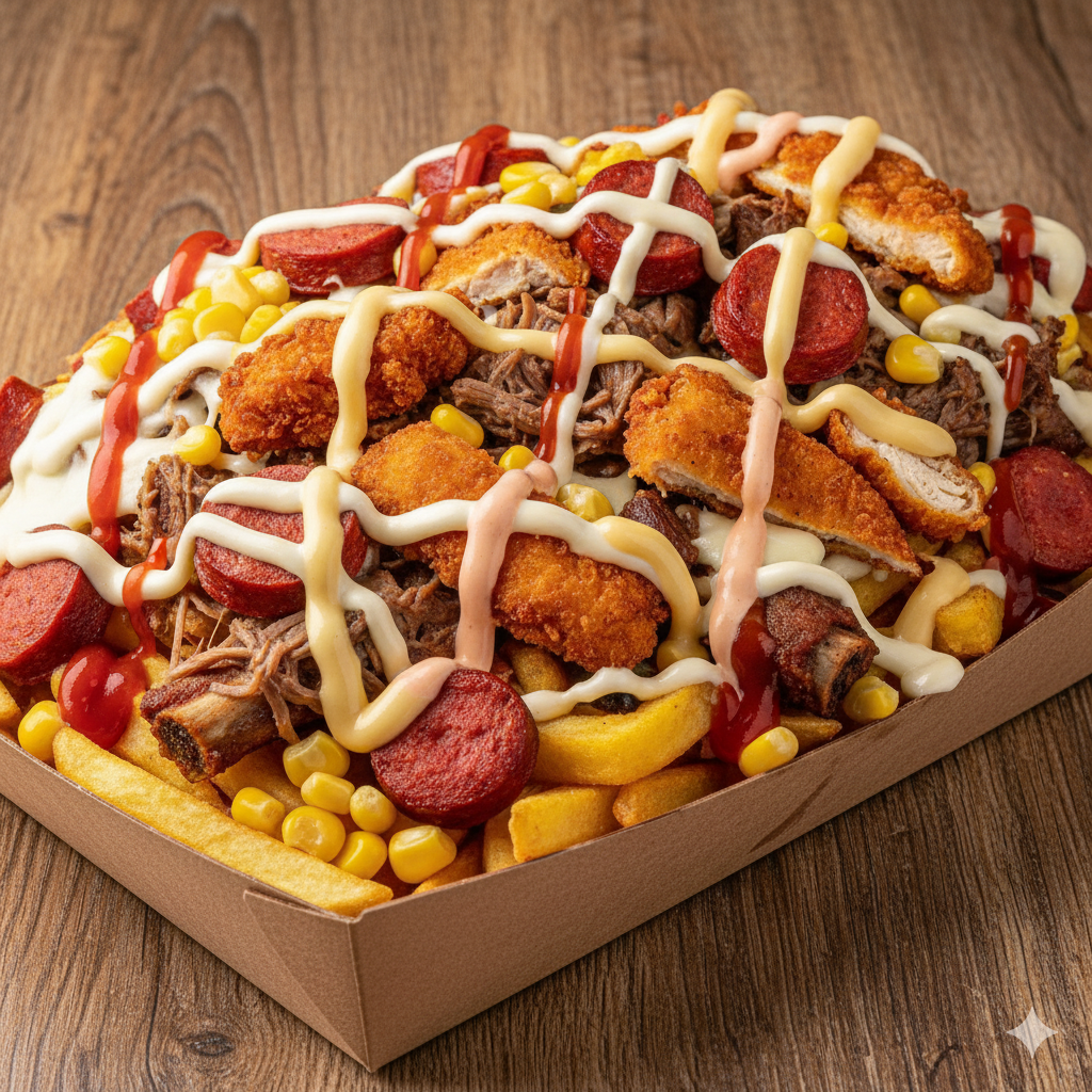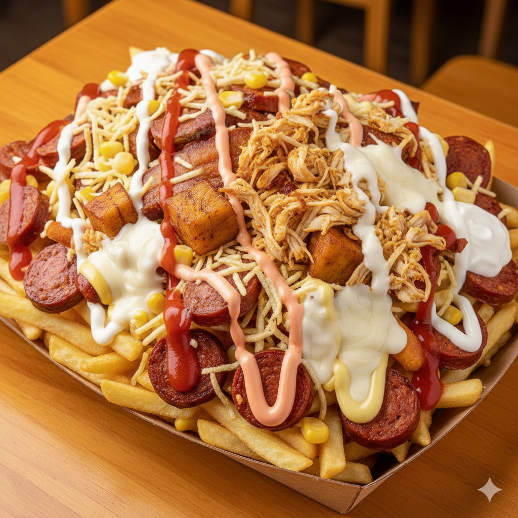 Papas a la francesa, salchicha, pollo, tocineta, maduro, maíz, mozzarella fundido.