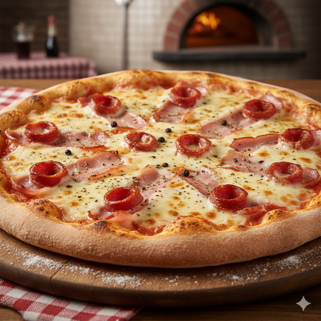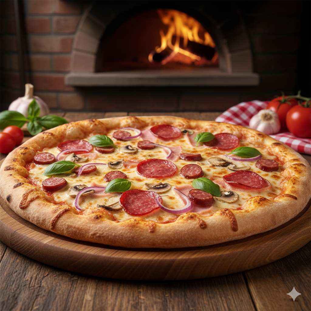 Salami, jamón, cebolla, champiñones, cábano y queso mozzarella fundido.