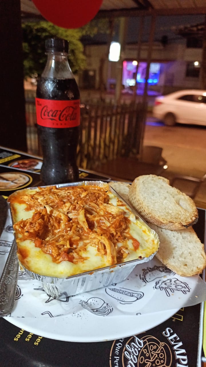 Carne a la boloñesa, pollo desmechado y queso mozzarella fundido.