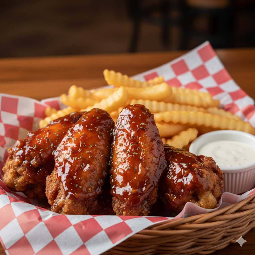 Alitas de pollo en salsa BBQ, acompañadas de papas a la francesa.