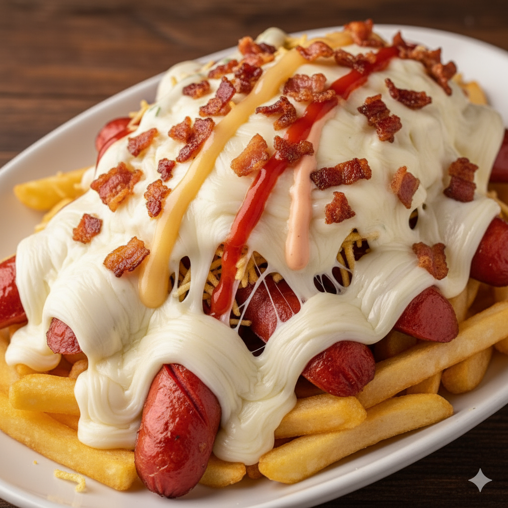 Papas a la francesa, salchicha, queso, salsa de la casa y mozzarella fundido.