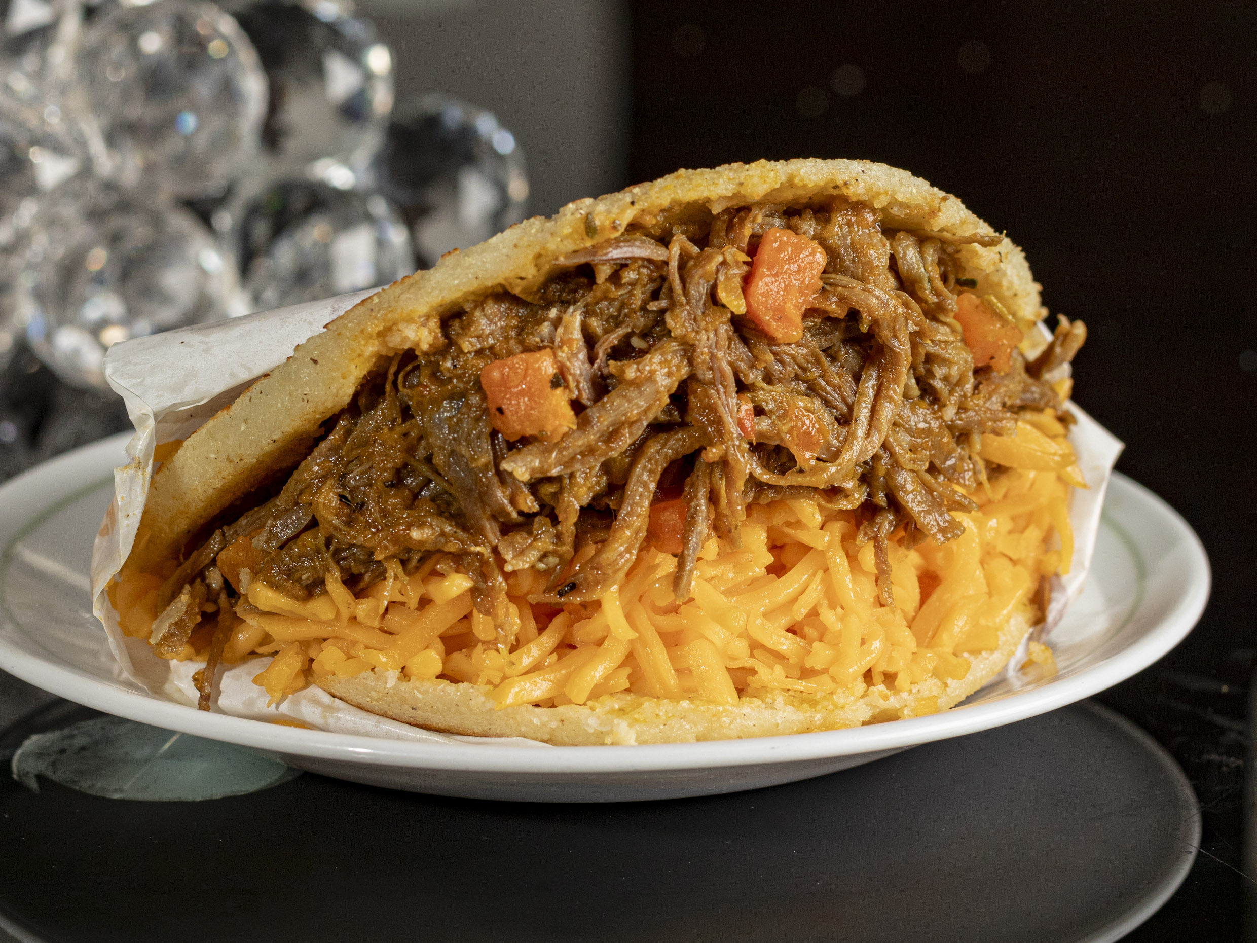 Arepa venezolana de harina de maiz asada + 170grs de relleno (13 cm de diametro) relleno de carne desmechada y queso cheddar rallado