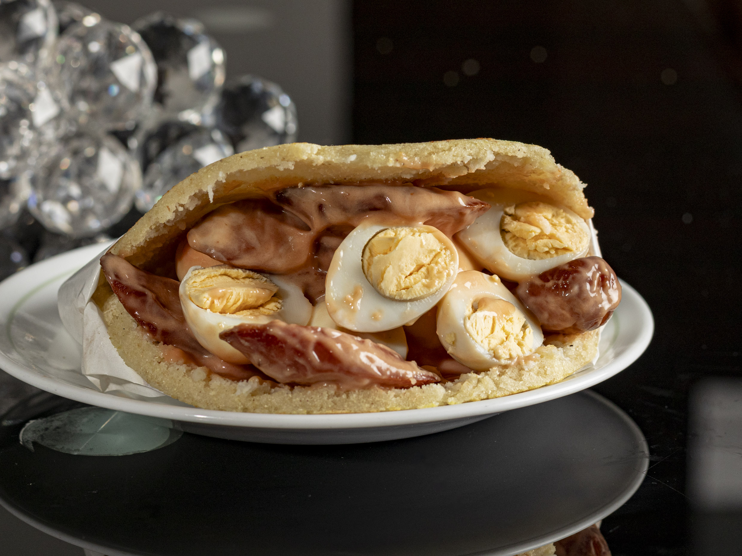 Arepa venezolana de harina de maiz asada + 170grs de relleno (13 cm de diametro) relleno de huevos de codorniz, salchichas y salsa rosada