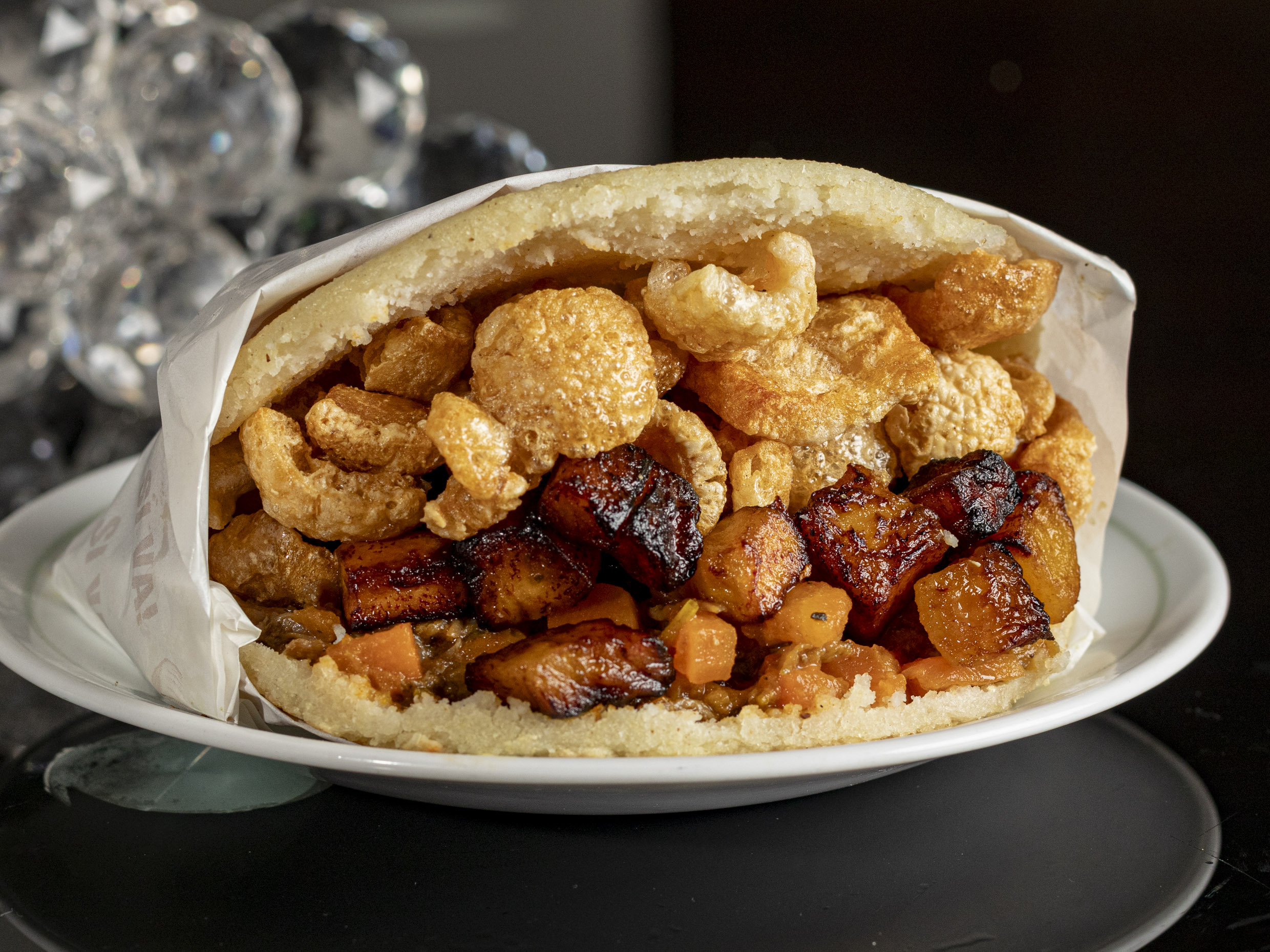 Arepa venezolana de harina de maiz asada + 170grs de relleno (13 cm de diametro) relleno de pollo desmechado, chicharrones y maduritos en cuadritos.