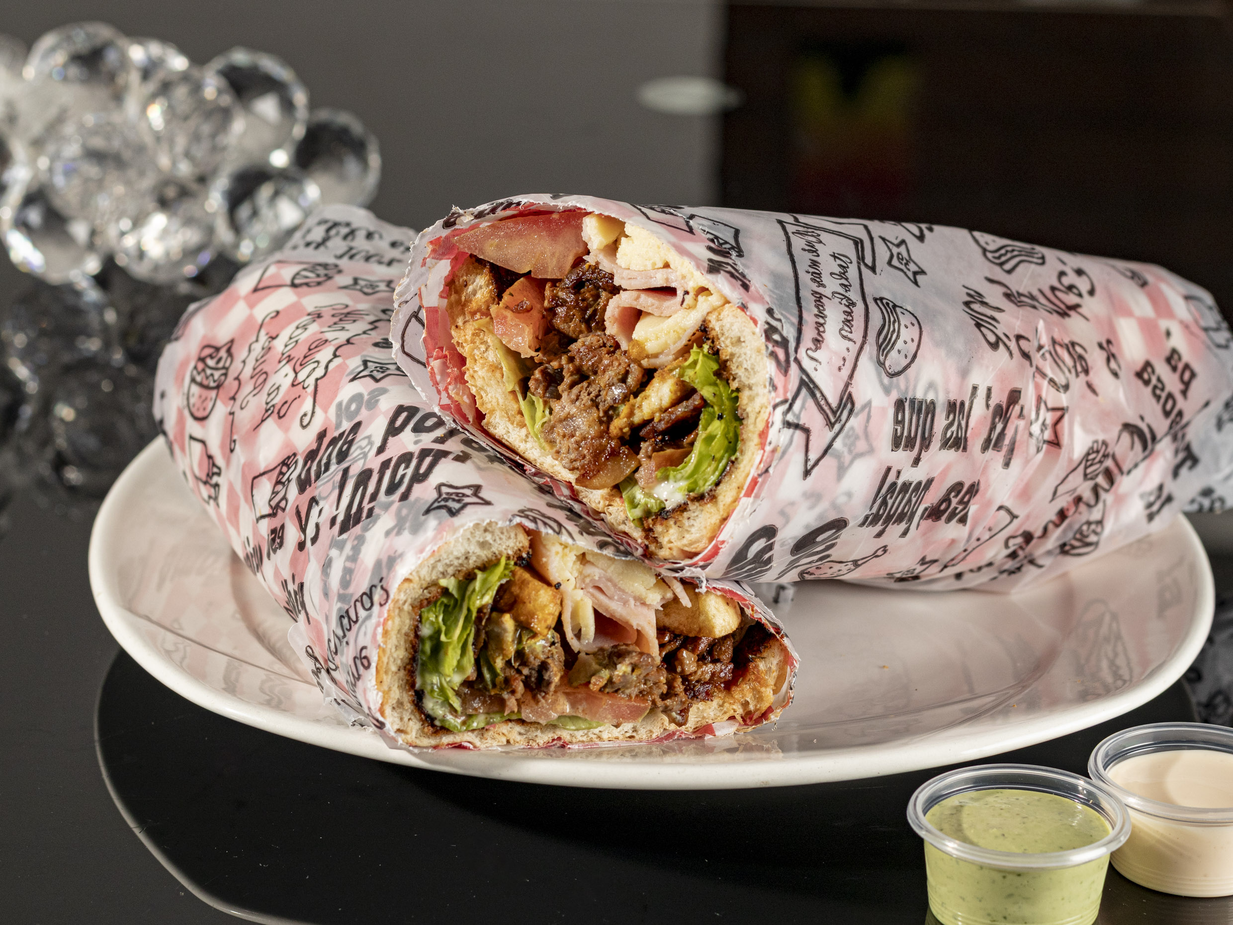 Pan de 30cm relleno con 200gr de carne de res, 200gr de pollo. tocineta, jamon, queso, tomate, lechuga y papas a la francesa con salsas de la casa