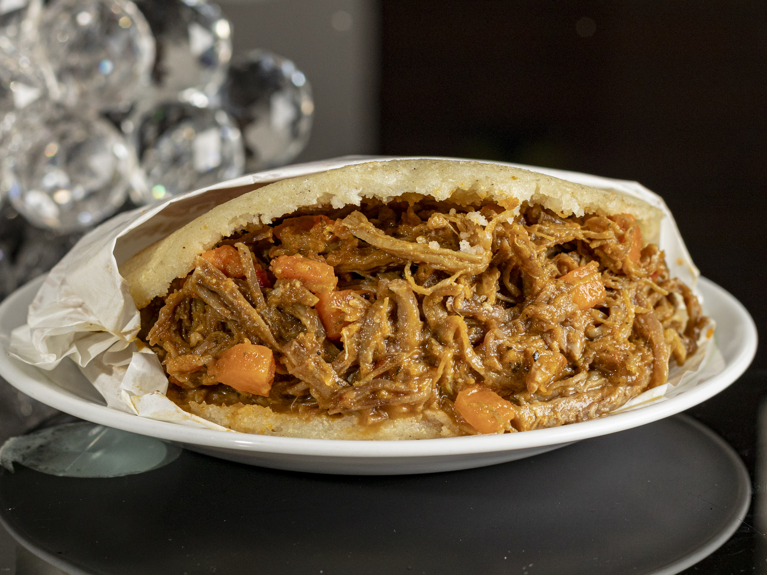 Arepa venezolana de harina de maiz asada + 170grs de relleno (13 cm de diametro) relleno de carne desmechada