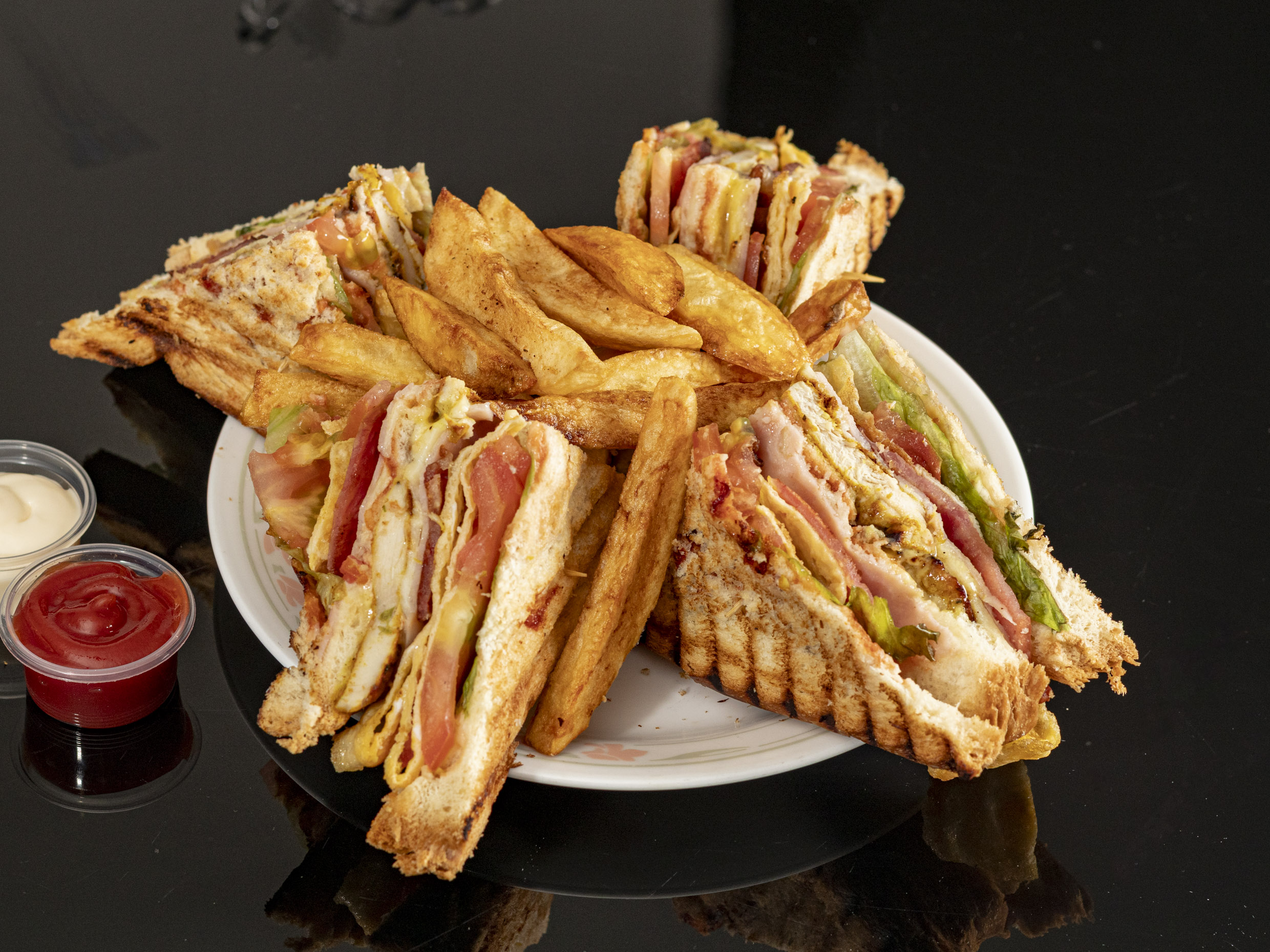 Sándwich triple de pechuga de pollo a la plancha, jamón, queso, tocineta crujiente, lechuga fresca, tomate y mayonesa, servido en pan tostado. acompañado de papas fritas doradas