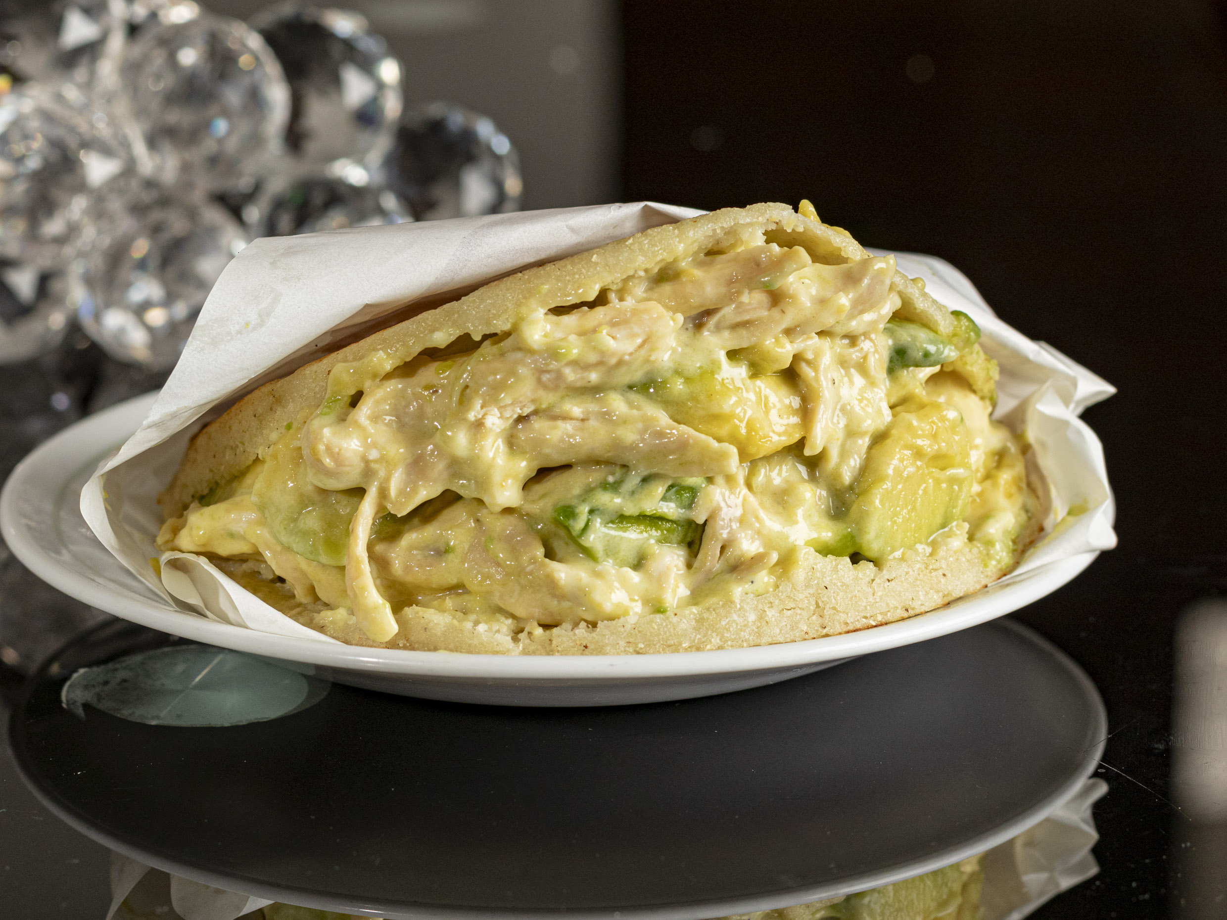 Arepa venezolana de harina de maiz asada + 170grs de relleno (13 cm de diametro) relleno de pollo, aguacate y salsa de la casa
