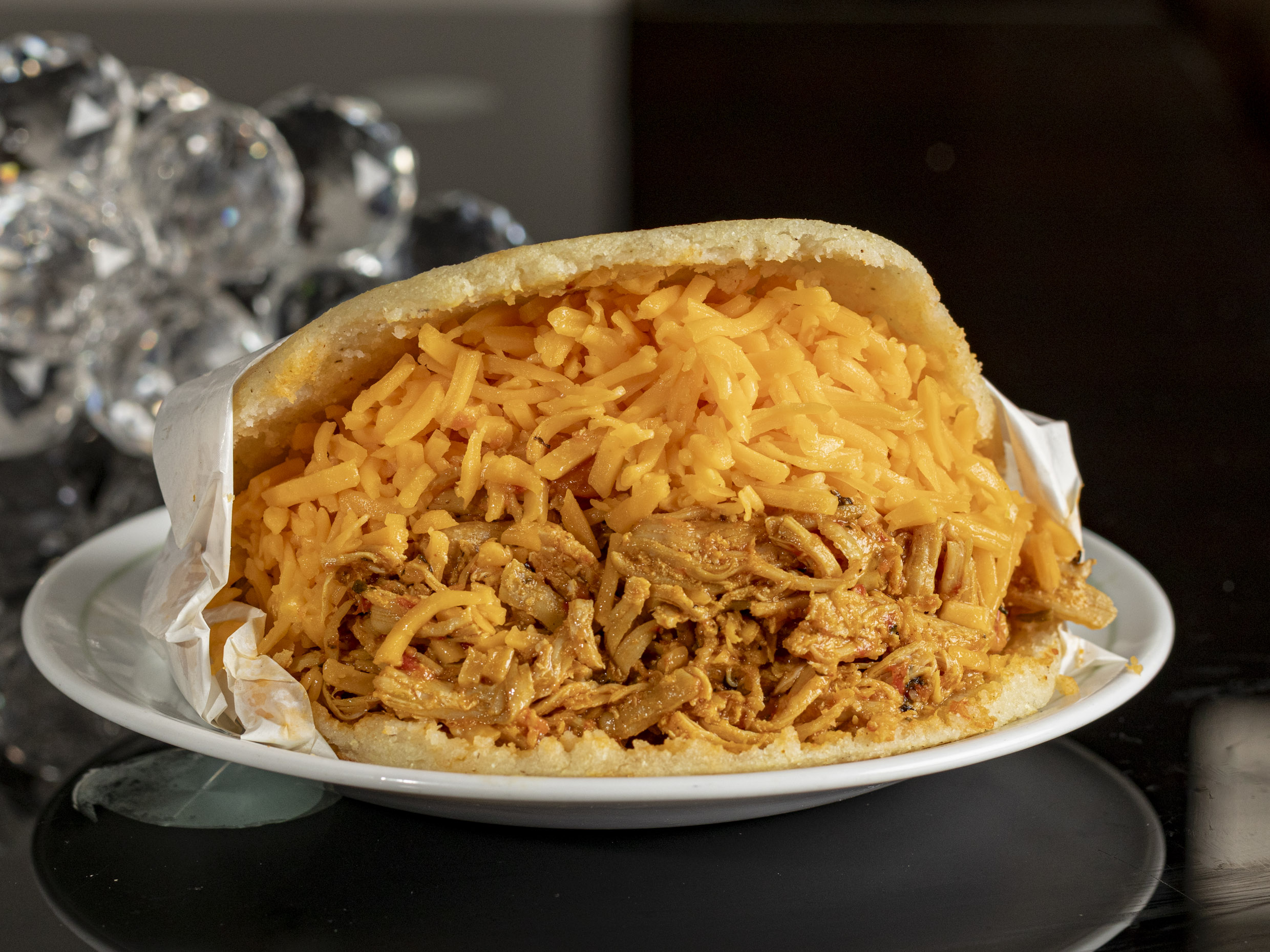 Arepa venezolana de harina de maiz asada + 170grs de relleno (13 cm de diametro) relleno de pollo desmechado y queso cheddar rallado