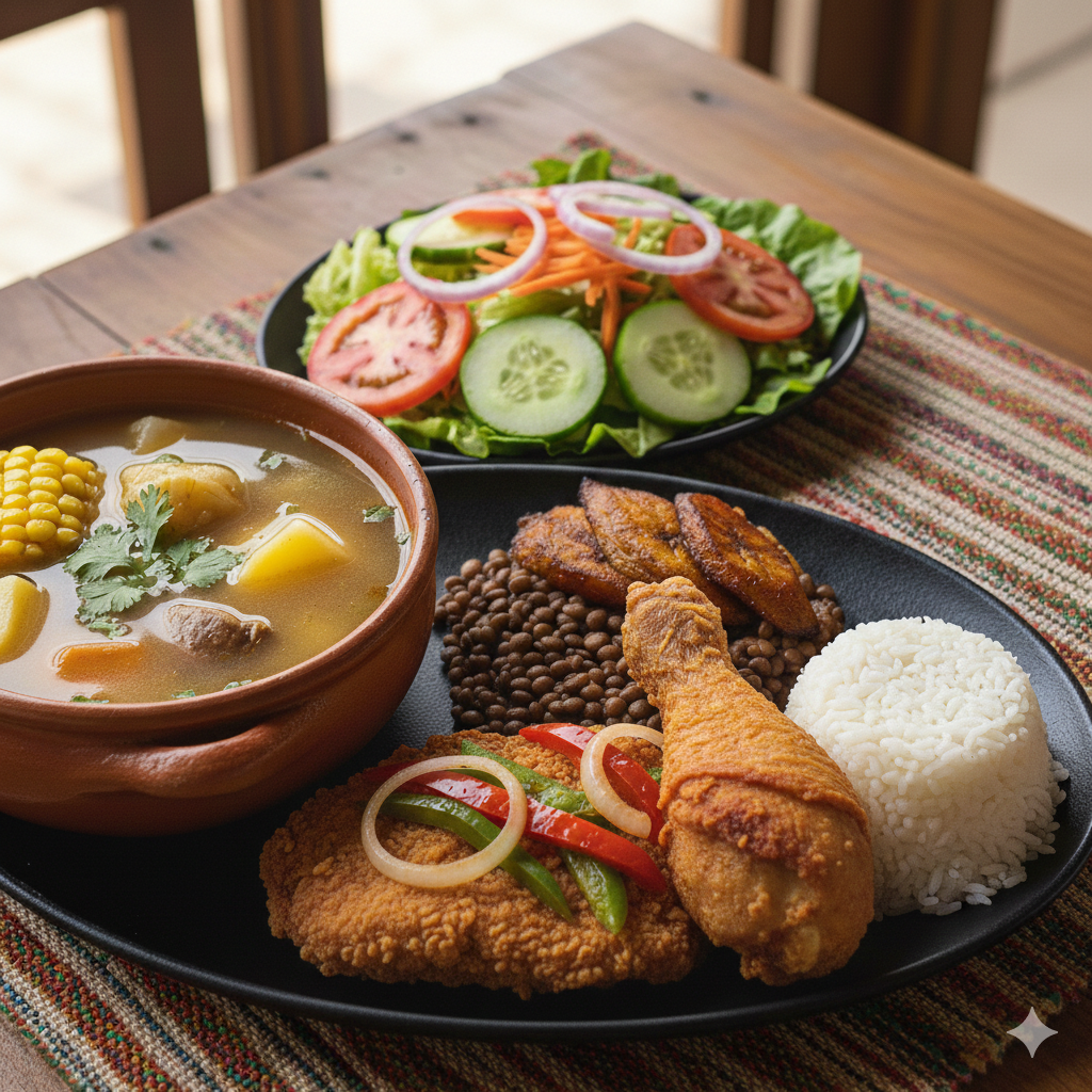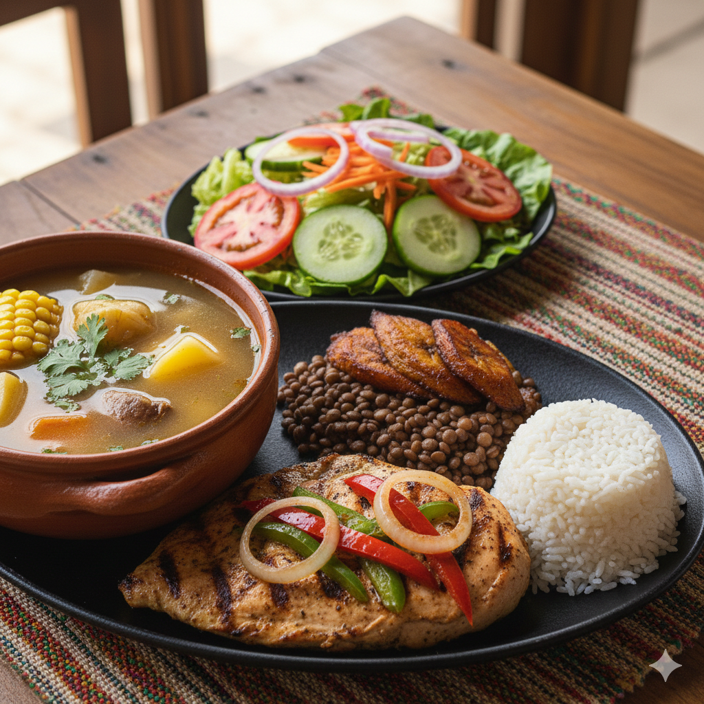 Sopa del día, filete de pollo a la plancha, ensalada (tomate, cebolla, batavia, pepino, zanahoria) frijoles o lentejas, arroz, maduro.