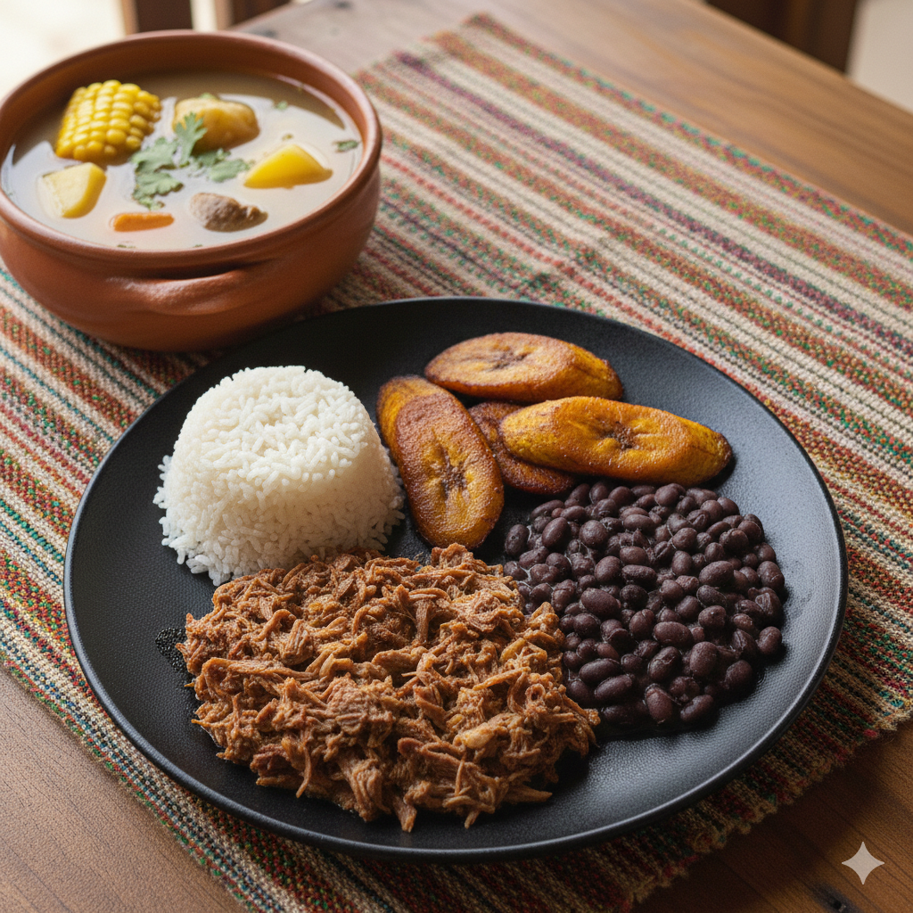 Sopa del día, carne desmechada, arroz, maduro, caraotas