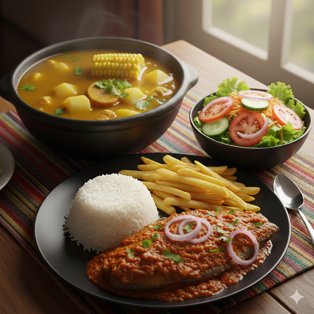 Sancocho de gallina o sancocho de pescado, pescado sudado(bagre) arroz, tajadas, frijoles o papa a la francesa, ensalada (tomate, cebolla, batavia, zanahoria, pepino).