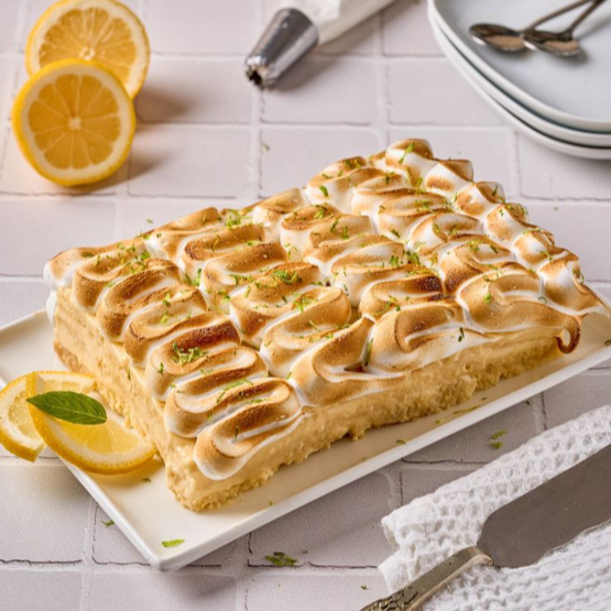 Tres capas de bizcocho semi húmedo, crema de vainilla combinada con curd natural de limón y cubierta con nuestro fresco merengue suizo.