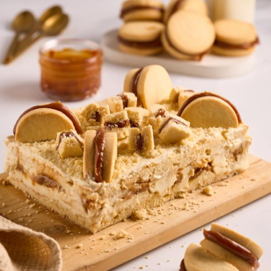 Nuestro clásico más vendido. Capas de bizcocho semi húmedo con crema de vainilla y trozos de alfajores rellenos de arequipe.