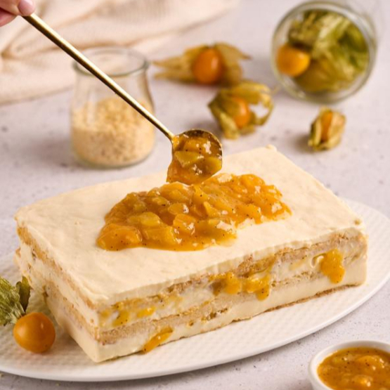 Tres capas de bizcocho semi húmedo, crema de vainilla combinada con mermelada natural a base de uchuvas, duraznos, mango, maracuyá, naranja tangelo y mandarina.