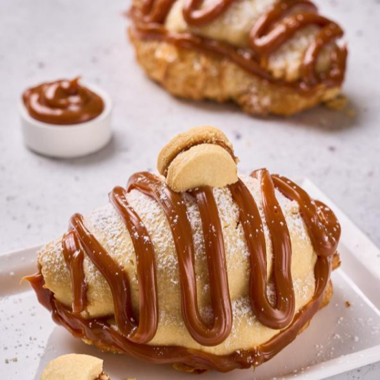 Croissant relleno con trozos de alfajor y arequipe, cubierta con masa de alfajor y más arequipe.