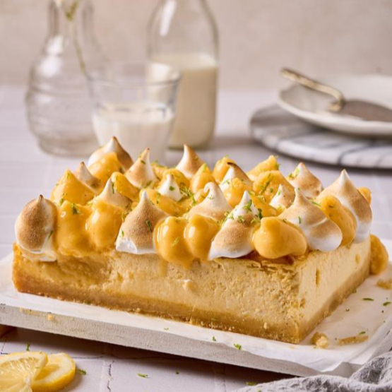 Base de galleta artesanal triturada, cremoso centro horneado elaborado con queso Philadelphia mezclado con curd de limón y cobertura con merengue suizo.