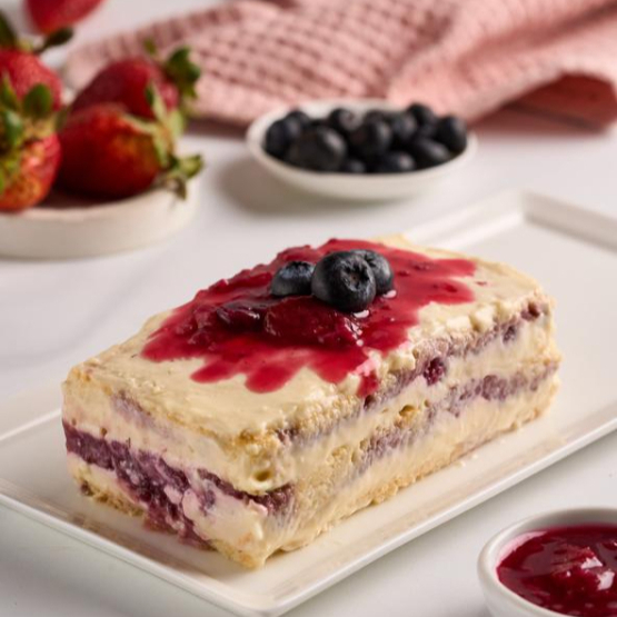 Tres capas de bizcocho semi húmedo, crema de vainilla combinada con mermelada natural a base de fresas, moras y arándanos.
