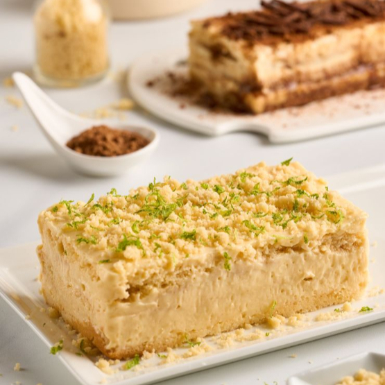 Tres capas de bizcocho semi húmedo, crema de vainilla combinada con curd natural de limón y cubierta con crumble.