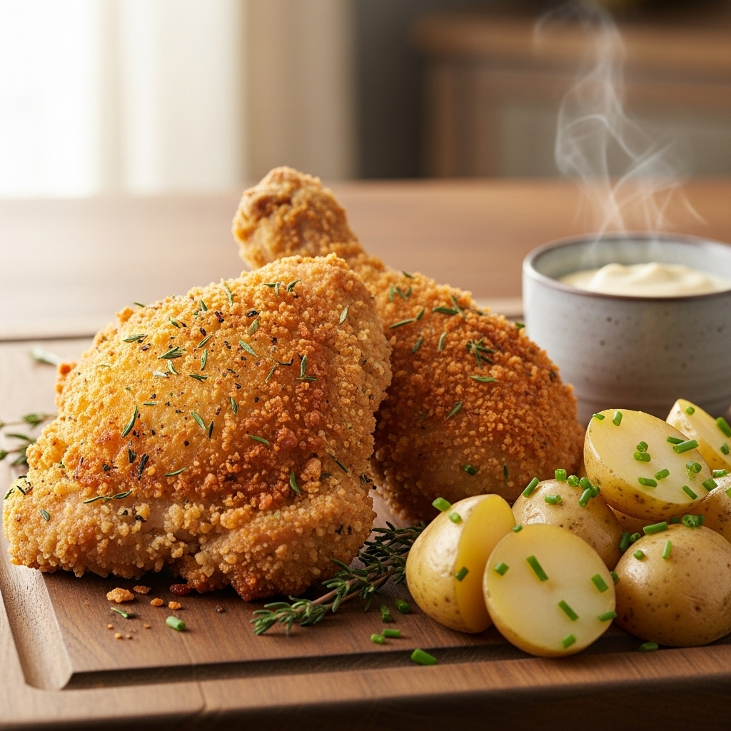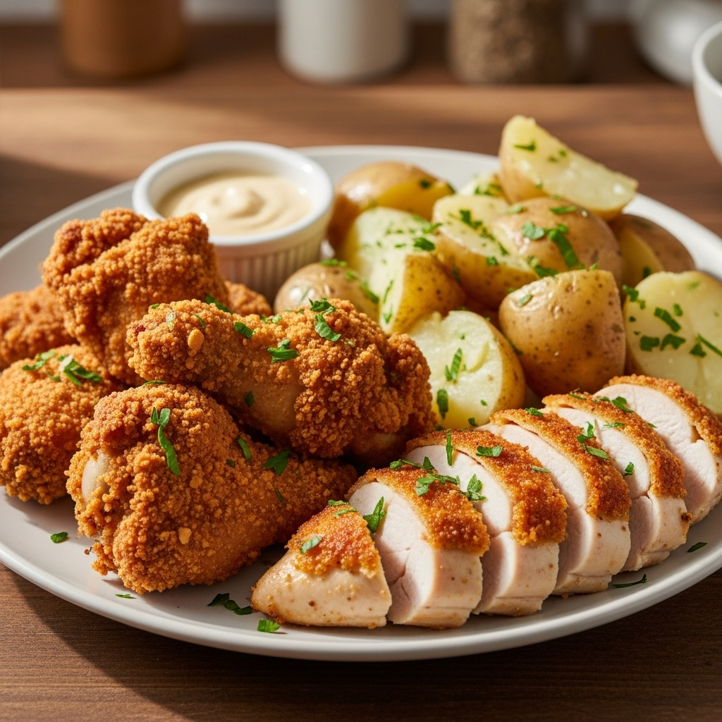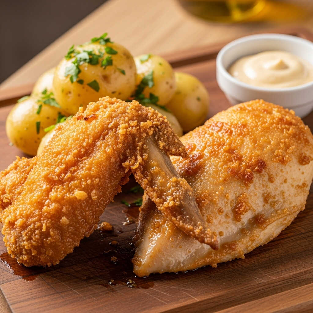 Delicioso pollo apanado acompañado de papa cocida, salsa de tomate, miel.
