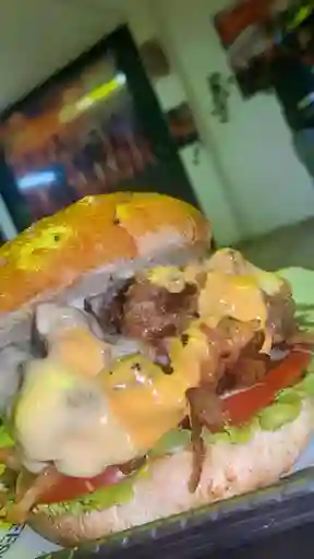 Hamburguesa con pan de finas hierbas, 130 g de carne, lechuga, tomate, cebolla, tocineta, carne picada y queso doble crema.
