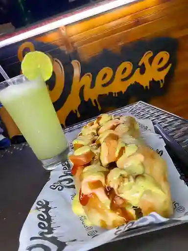 Perro caliente con pan artesanal, piña calada, ripio de papa, salchicha americana, cebolla BBQ, tocineta, queso doble crema acompañado de papas a la francesa y gaseosa de 400 ml.