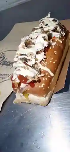 Perro caliente con pan artesanal, piña calada, tocineta, ripio de papa, chorizo, pollo y queso doble crema.