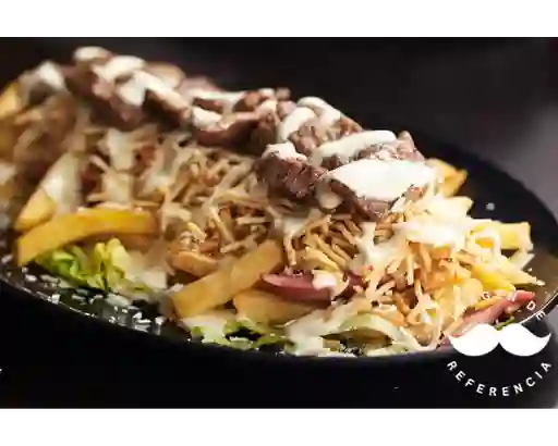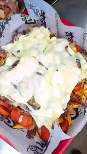 Salchipapa, con papa francesa rústica 550 g, 350 g de salchicha, tocineta, carne molida, pollo, chorizo, queso doble crema.