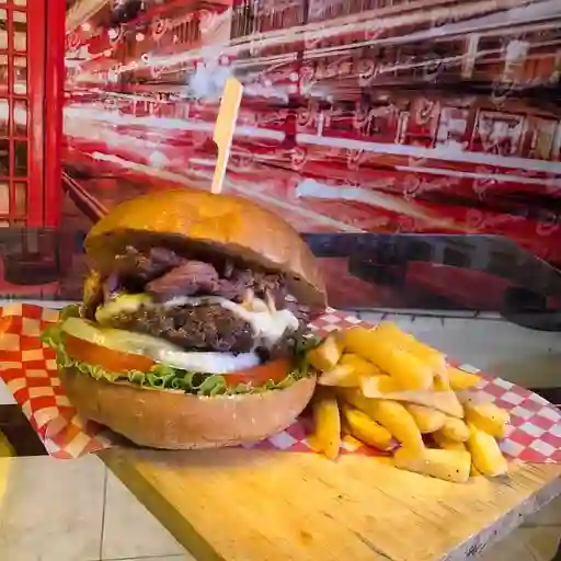 Hamburguesa con pan de finas hierbas, 130 g de carne, lechuga, tomate, cebolla, tocineta, carne picada y queso doble crema acompañada de papas y gaseosa de 400 ml.