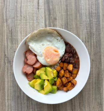 Arroz integral, frijoles, aguacate, maduritos, chorizo y huevo frito