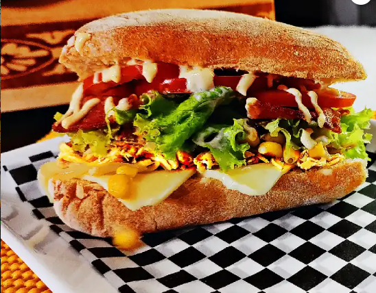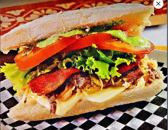 Pollo, carne de res, tocineta, tomate, lechuga, cebolla caramelizada y queso mozzarella.