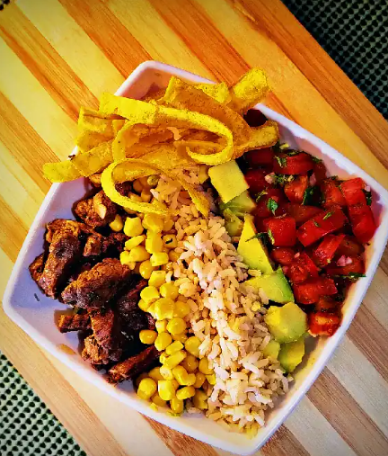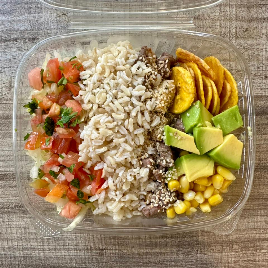 Arroz integral, lomo de res, maíz, pico de gallo, aguacate, lechuga batavia, chips de plátano y aderezo de yogurt griego.