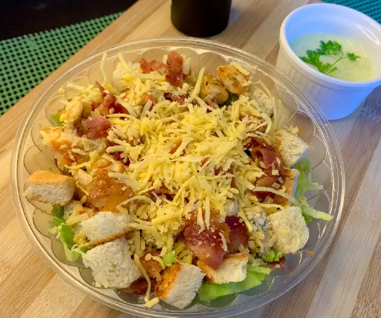 Lechuga, pollo, tocineta, queso parmesano, crotones de pan y aderezo de yogurt griego.