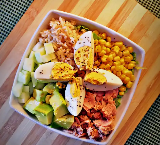 Arroz integral, lomo de atún, maíz, pepino, huevo duro, aguacate, lechuga y aderezo de yogurt griego.