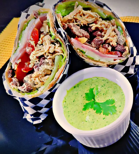 Pollo, tocineta, tomate, lechuga, aguacate, cebolla, maíz, pepino, queso cuajada y aderezo de yogurt griego.