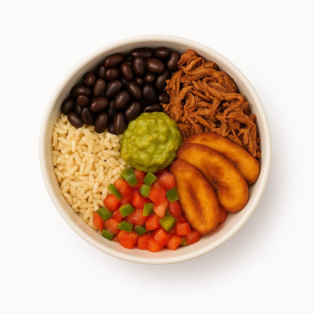 Arroz integral, carne desmechada, frijol caraota, maduritos, pico de gallo y guacamole