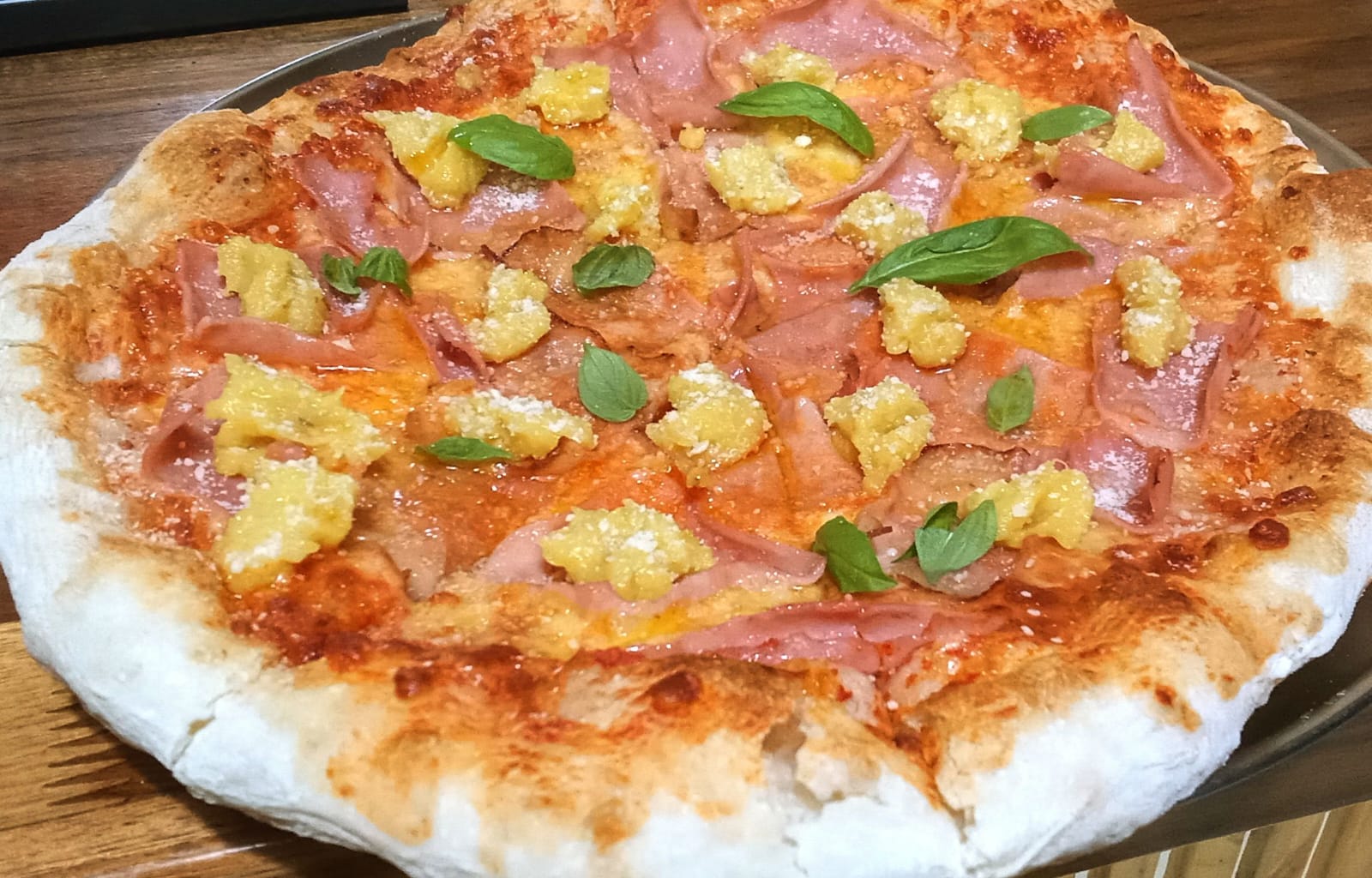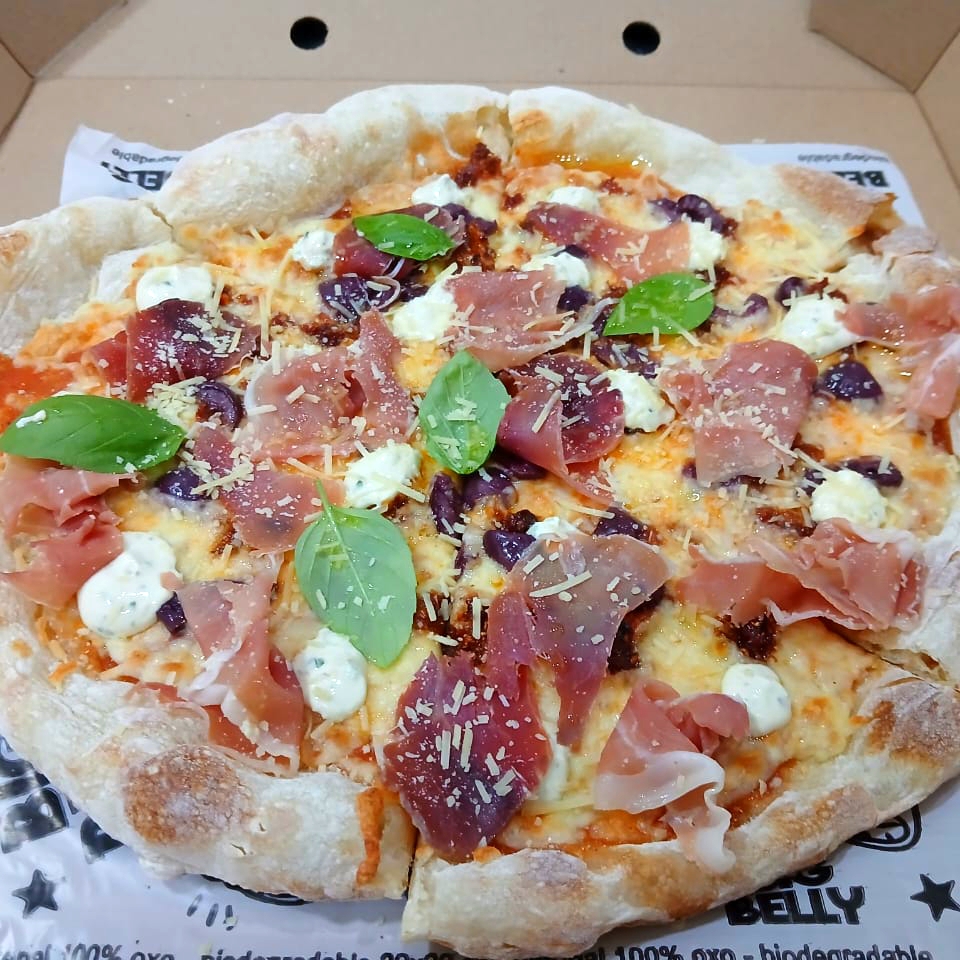 Jamon serrano curado 14 mesas. crema ricotta. parmesano. aceituna negra. albahaca fresca-mozzarella. salsa de tomate